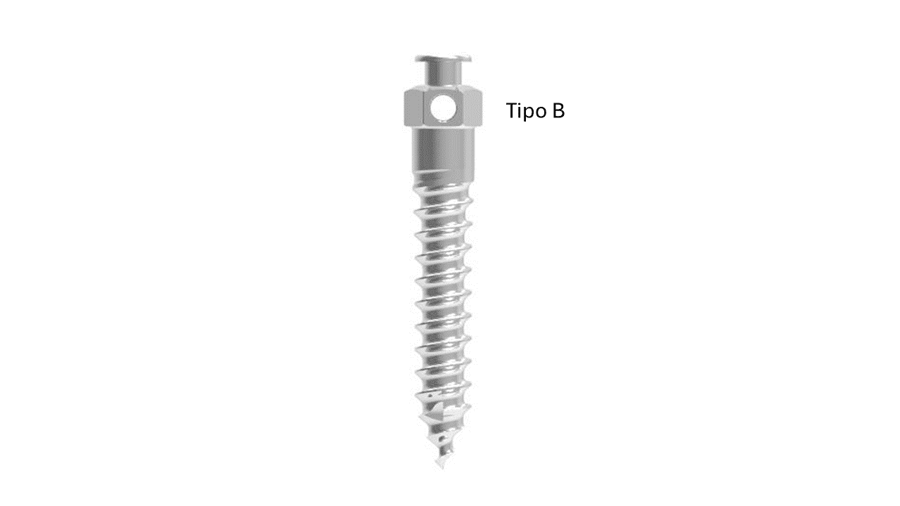 los mini implantes tipo B, cuentan con un perfil transmucoso de 1.5mm. con un ojal y cabeza de boton para facilitar la colocacion de aditamentos.