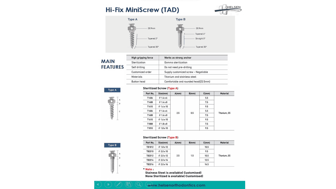 Los mini implantes tipo A su perfil transmucoso es de 0.5mm. con un ojal y cabeza de boton.